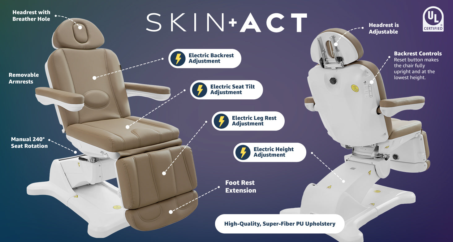 The 4-motor Malibu Electric Medical Spa Treatment Chair/Table is an exclusive chair providing high comfort and great stability. It works well in all kinds of environments from spas to doctor’s offices. Specially designed to optimize your workspace, this bed has four motors that control seat height and seat angle, backrest angle, and footrest angle. Additionally, it can be manually rotated 240°. This model also has reversible arms and an adjustable headrest. The high-quality super-fiber PU upholstery is extremely easy to clean.