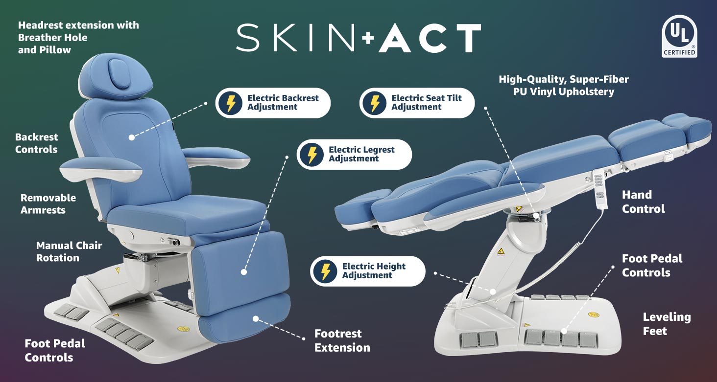 The 4-Motor PalmaElectric Medical Spa Treatment Chair/Table is an exclusive chair providing high comfort and great stability. It works well in all kinds of environments from spas to doctor’s offices. Specially designed to optimize your workspace, this bed has four motors that control seat height and seat angle, backrest angle, and footrest angle. Additionally, it can be rotated 75° to each side. This model also has reversible arms and an adjustable headrest. The high-quality super-fiber PU upholstery is extremely easy to clean.