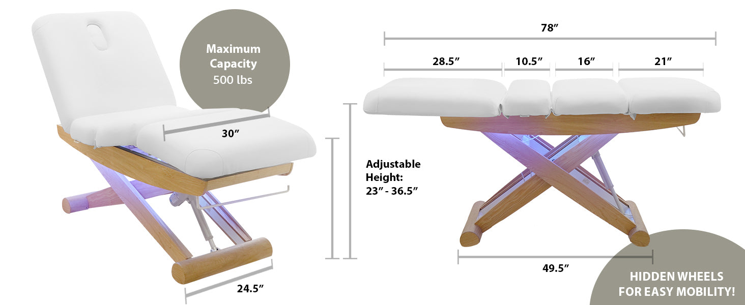The Sage Electric Spa Treatment Table is perfect for a variety of body and facial treatments. It boasts a cozy and customizable 4 section top, along with an elegant scissor-shaped metal base structure that has a lovely natural wood finish. With the convenience of 3 motors, this table effortlessly adjusts the height, backrest, and central module inclination, all controlled by a handy remote.
