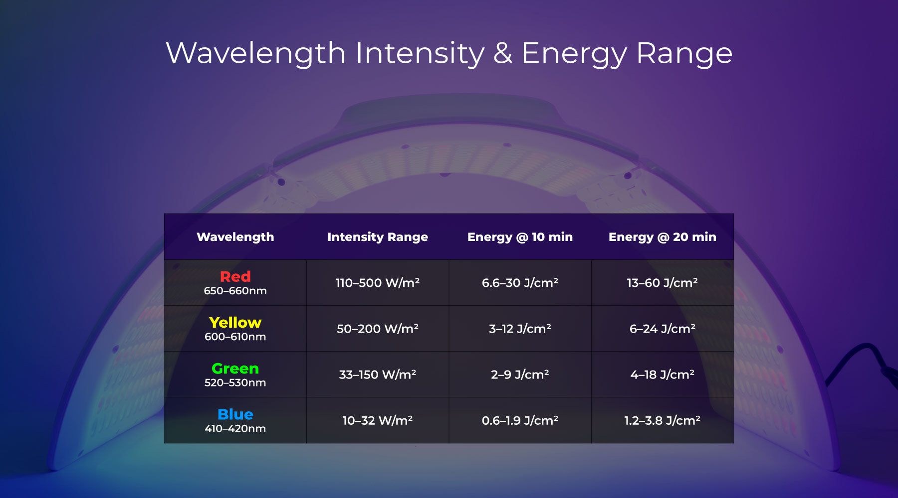 | Wavelength | Intensity Range | Energy @ 10 min | Energy @ 20 min |