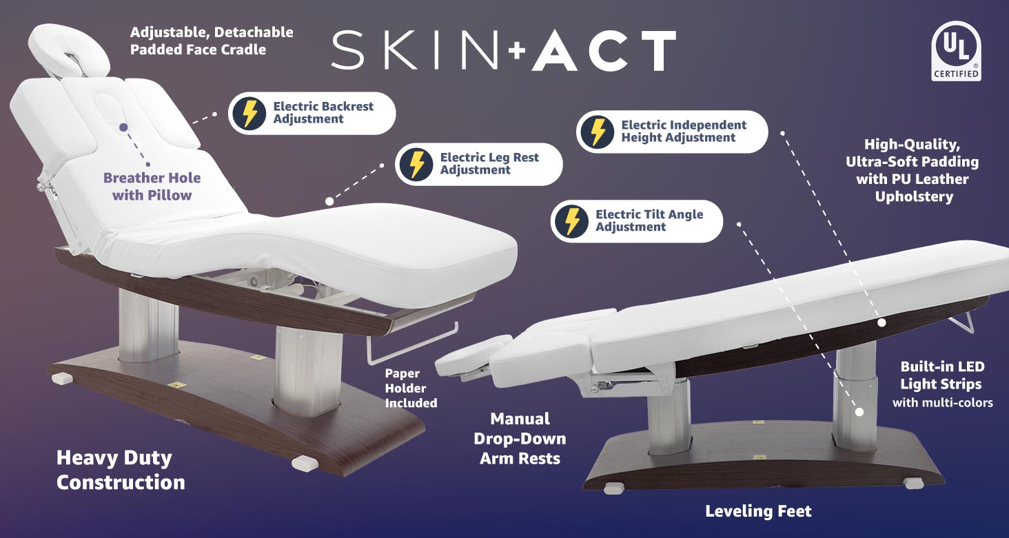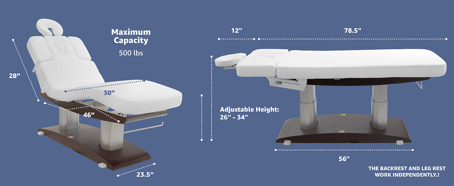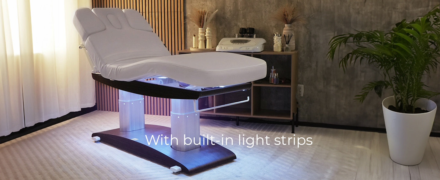 The Bale Spa Facial Massage Treatment Table has a one-of-a-kind design with nearly unlimited positioning combinations which will give you the ultimate freedom. With built-in LED light stripes to customize unique vibrant illuminating colors built into the Bale bed. It has ultra-plush fabric which is easy to clean and maintain. There is a stylish handheld remote with a long cord. Even at the steepest angle the bed will excellently distribute the load weight. Please watch the video to see all the features in action.