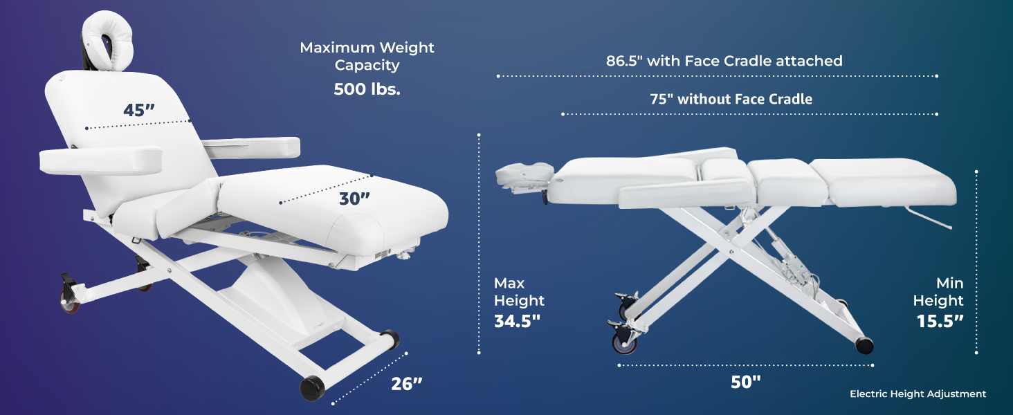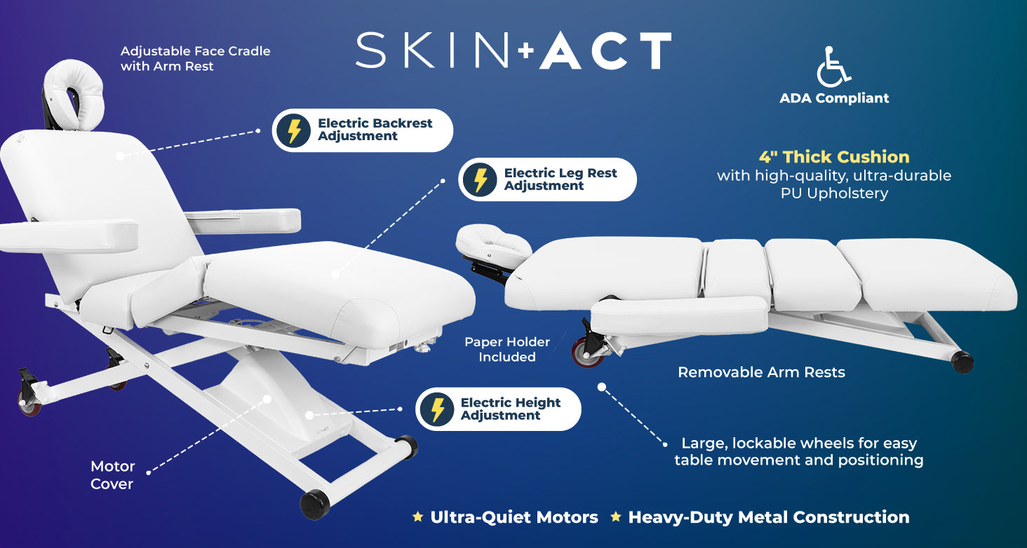 We are excited to present the ADA compliant Cleo Electric Spa Treatment Table. The new technology enables the table to have more fine adjustments, quiet operation, and a sleek appearance. This professional treatment table would be great for your day spa and medical spa needs. Please watch the video to see all the features in action.