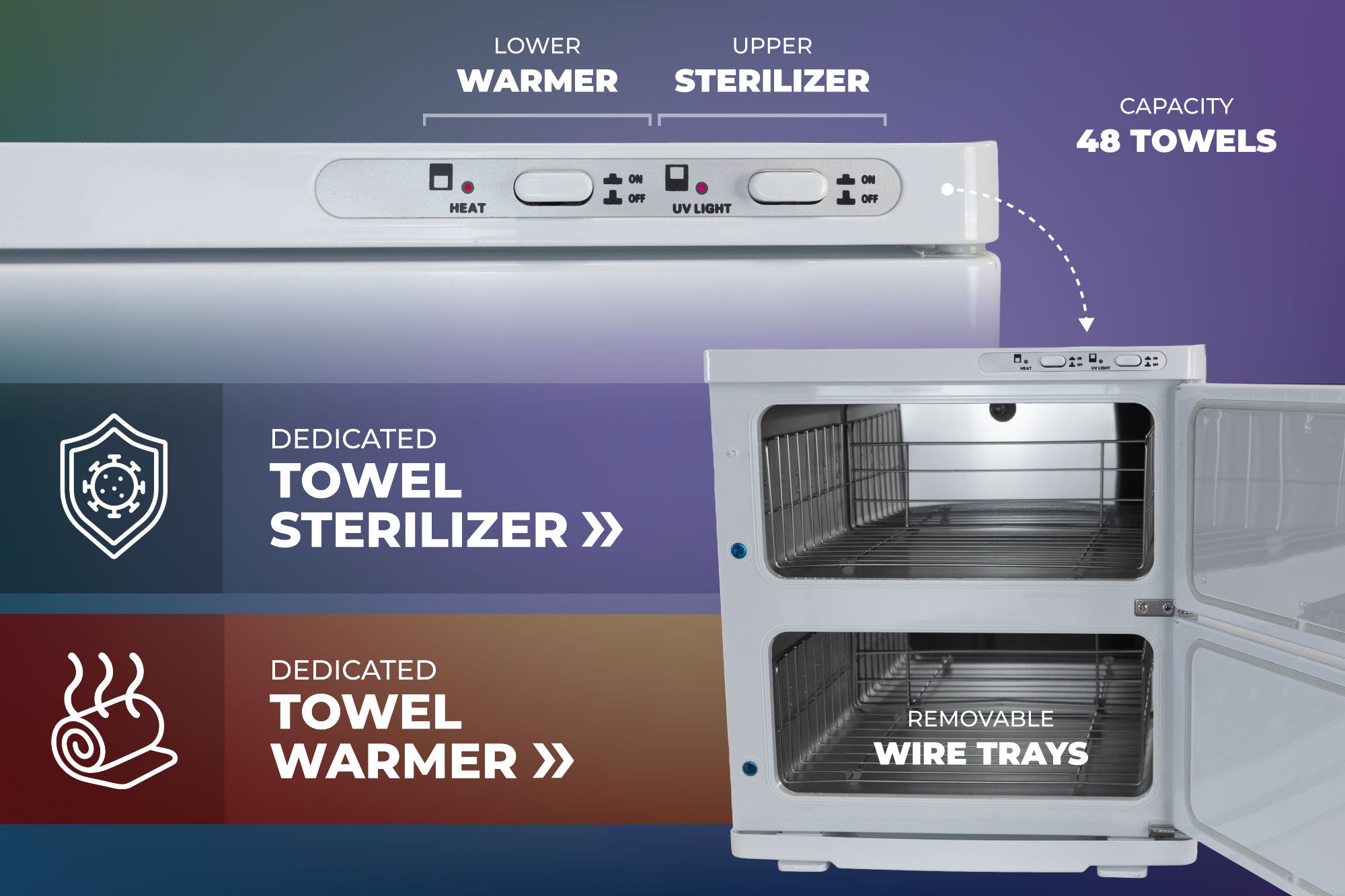 The combo Hot Towel Cabinet with Sterilizer heats towels for refreshing, hygienic treatments in each cabinet. The bottom level warms towels while the top lever sterilizes. The pull down doors allows for easy removal of your towels. The drip tray catches all excess water to keep your counters dry. The sturdy frame allows for many years of trouble free and safe operations.
