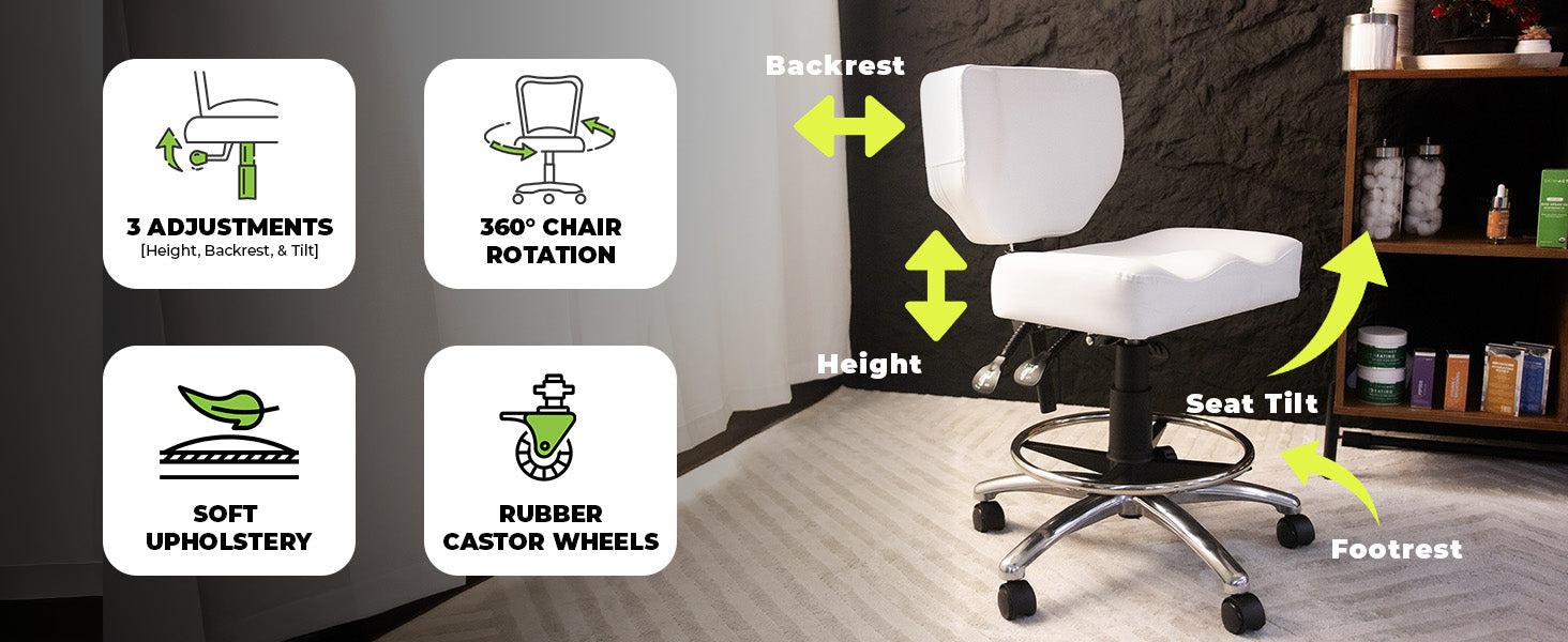 The SkinAct Comfortable Esthetician Chair is designed for superior comfort and support in salon and spa settings. It features an extra-wide seat cushion, adjustable lumbar support, seat tilt, and height, plus a 360-degree swivel for easy maneuverability. This ergonomic and versatile chair enhances client comfort and makes treatments easier for busy estheticians. Durable and easy-to-clean, it's an essential addition to any professional workspace.