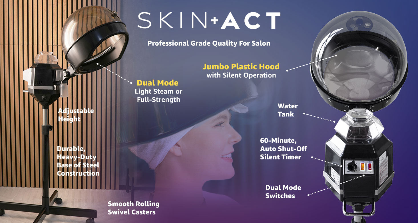 The Elite Hair Steamer by SkinAct is a professional-grade salon essential that delivers reliable steam care through a jumbo plastic hood with two power settings—310 W for light steam and 620 W for full strength—to suit a variety of hair treatments. It operates silently without disruptive ticking noises, includes a 60-minute auto-shutoff timer, and stands on smooth swivel casters with adjustable height, ensuring convenience and mobility during use. Quiet, safe, and backed by a 1‑year warranty, this steamer blends performance and practicality in a sleek, salon-ready design.