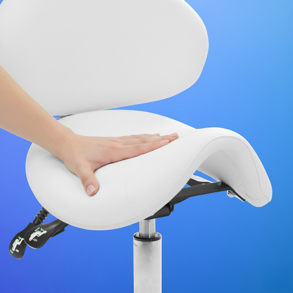 The Esthetician Saddle Stool is a compact and feature-rich seating solution, ergonomically crafted to support estheticians during extended treatment sessions. It offers comprehensive adjustability—including seat height, seat tilt, backrest height, and backrest angle—allowing users to fine-tune their posture for maximum comfort and precision. With a sturdy metal base measuring 22″ in diameter and a seating range from 22.5″ to 28.5″ high, the stool supports up to 400 lb while weighing just 35 lb, making it both stable and portable. The contoured seat cushion (16.5″×14″) and lumbar-support backrest (18″×11″) are upholstered in easy-to-clean vinyl, and the entire unit is backed by a 1‑year warranty—making it a smart, professional choice for beauty, spa, and medical environments.