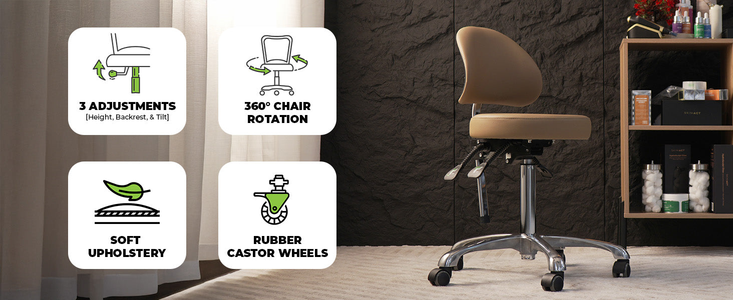 Introducing the Gold Series Esthetician Stool, the epitome of luxury and functionality for estheticians. Crafted with meticulous attention to detail, this stool boasts adjustable seat height, backrest height, seat tilt, and backrest angle, ensuring personalized comfort during long hours of use. Despite its premium features, it weighs only 24 lbs. making it effortlessly portable yet sturdy with a weight capacity of 400 lbs. Available in elegant White, sophisticated Gray, classic Black, and the all new Camel Orange, the Gold Series Esthetician Stool adds a touch of sophistication to any salon, spa, or medical office environment. It's the perfect blend of style and practicality, enhancing both aesthetics and efficiency for estheticians.