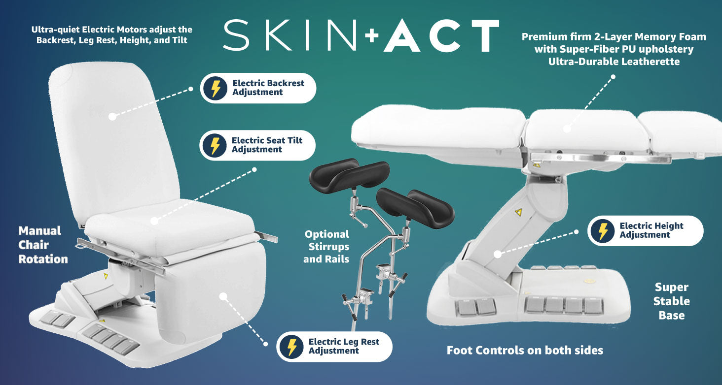 The Kana Electric Medical Spa Treatment Table is an innovative facial chair/bed that enhances spa and medical aesthetic treatments. It boasts advanced features, including electric controls for precise adjustments such as backrest angle, leg rest angle, height, and seat tilt. These customizable movements guarantee optimal positioning for various spa procedures, ensuring client comfort and facilitating practitioners' work. Moreover, the table offers manual chair rotation, adding versatility to its functionality. Made with high-quality materials, the Kana Electric Medical Spa Treatment Table combines durability with ergonomic design, providing a sophisticated and adaptable platform for a wide range of facial and body treatments.
