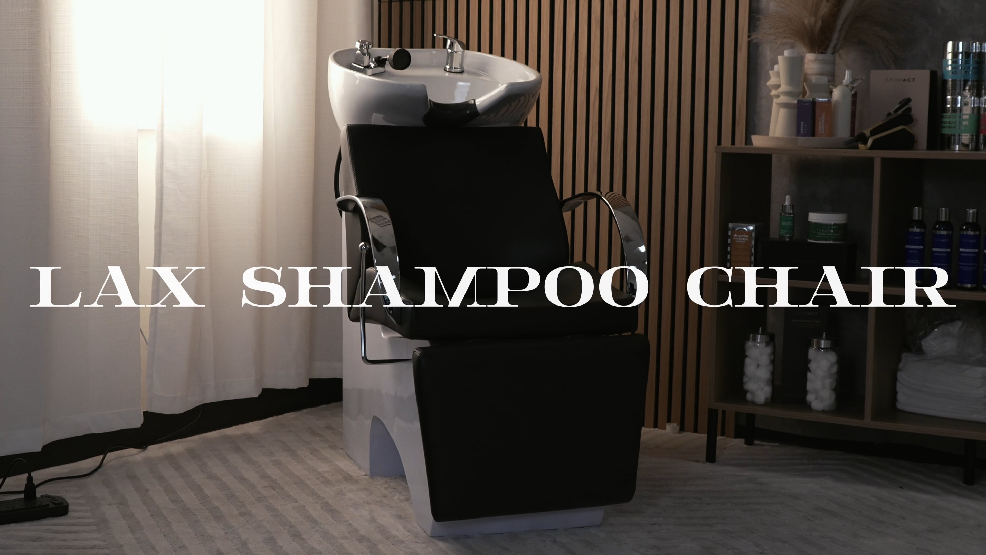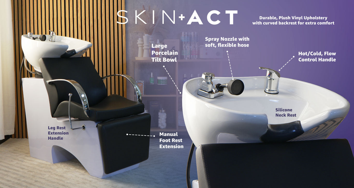 The Lax Shampoo Chair from SkinAct is a sleek and durable backwash unit featuring a porcelain tilting bowl, faucet with soft-spray hose, and a silicone neck rest atop an arched, cushioned seat. It includes a reclining footrest, chrome armrests, a drain assembly with strainer, and a vacuum breaker for professional-grade plumbing compatibility. With generous dimensions (54″ fully extended length, 23.5″ arm‑to‑arm width, bowl height at 40″, seat height at 20″), this chair offers clients luxurious comfort, all backed by a reassuring 1‑year warranty.