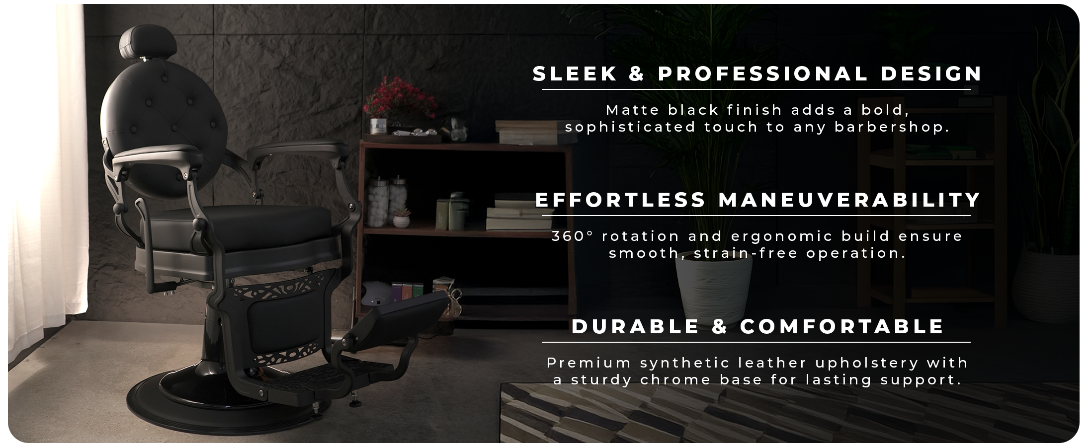The Legacy Barber Chair is built for professionals who value both comfort and durability. Designed with an ergonomic structure, it offers a 360-degree rotation for effortless maneuverability, reducing strain and enhancing workflow. Its sleek matte black finish adds a touch of elegance, making it a statement piece in any barbershop. Upholstered in high-quality synthetic leather and supported by a sturdy chrome base, this chair is made to withstand the demands of a busy salon while maintaining its sophisticated appearance. Equipped with a hydraulic oil pump, it provides smooth and quiet operation, ensuring an effortless experience for both barbers and clients.