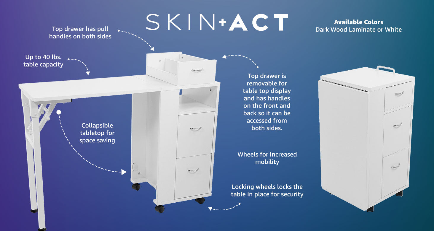 The professional foldable manicure table with drawers is available in Dark Wood laminate or White colors. Table folds into the cabinet.
