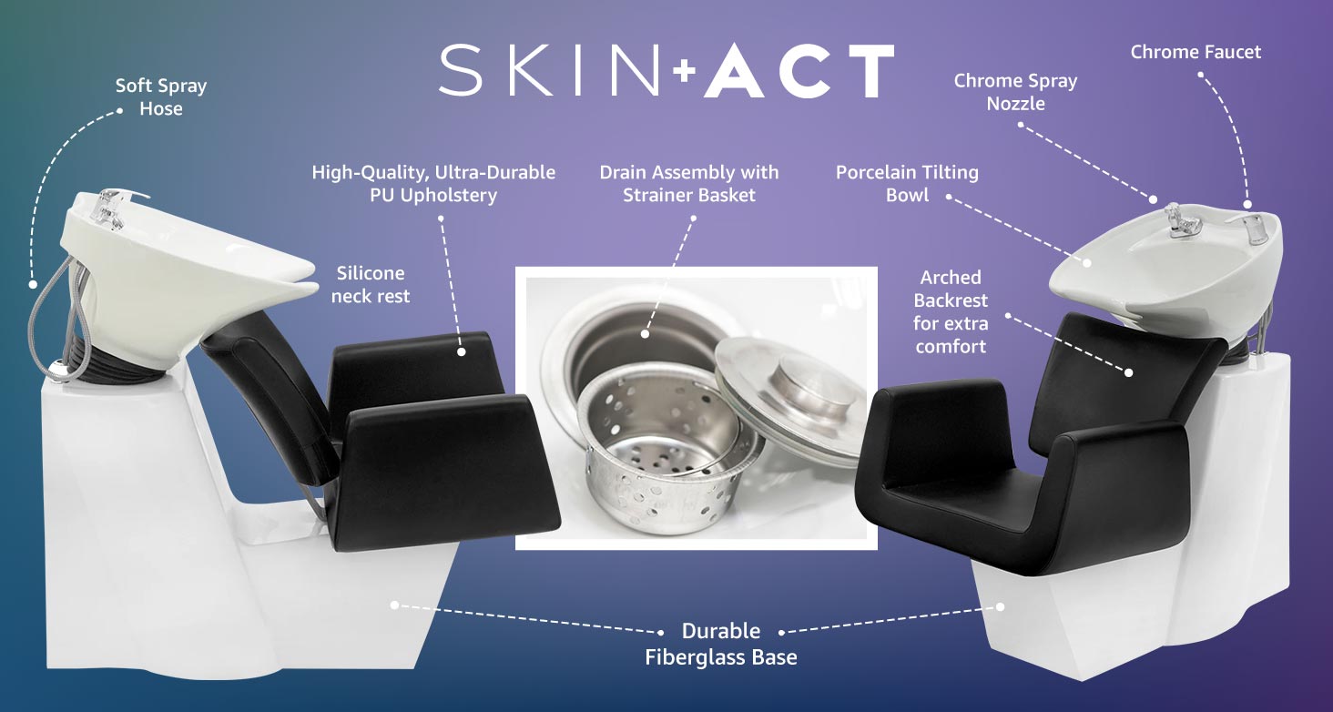 The SkinAct Moda Shampoo Chair is designed for both style and comfort, featuring an arched backrest that provides added support during treatments. It comes equipped with a porcelain tilting bowl for easy positioning, a faucet, a soft spray hose for gentle rinsing, and a silicone neck rest to enhance client relaxation. A complete drain assembly with strainer ensures efficient water flow, making this chair a practical and elegant addition to any salon shampoo station.