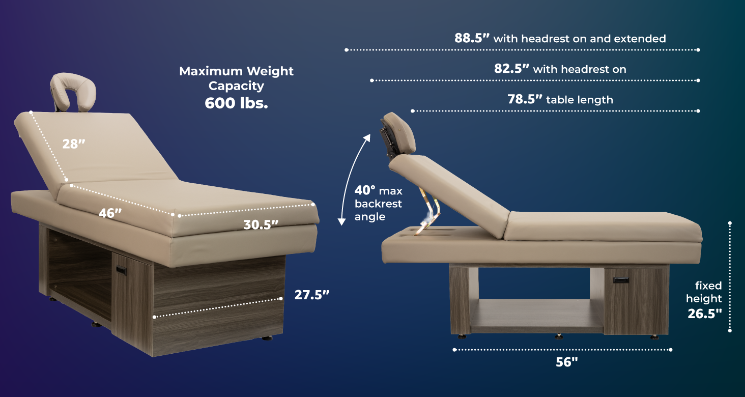 The Murade Treatment Table is an elegant bed wrapped with ultra-plush material which is long-lasting and comfortable to the touch. It comes preassembled so there’s no heavy lifting to put it together. The backrest angle is manually adjustable, and the table comes with an adjustable face cradle. Please watch the video to see all the features in action.