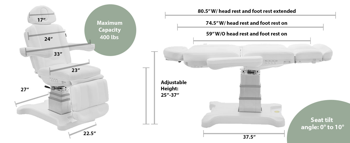 The 4-Motor Palermo Electric Medical Spa Treatment Chair/Table is an excellent chair with great structural stability and high comfort. It’s designed to optimize the workspace with its 150° manual rotation and four motors that independently control height, backrest angle, footrest angle, and seat tilt. This model also has reversible arms and an adjustable headrest. With its high-quality super-fiber PU upholstery, it’s both elegant looking and extremely easy to clean. Please watch the video to see all the features in action.
