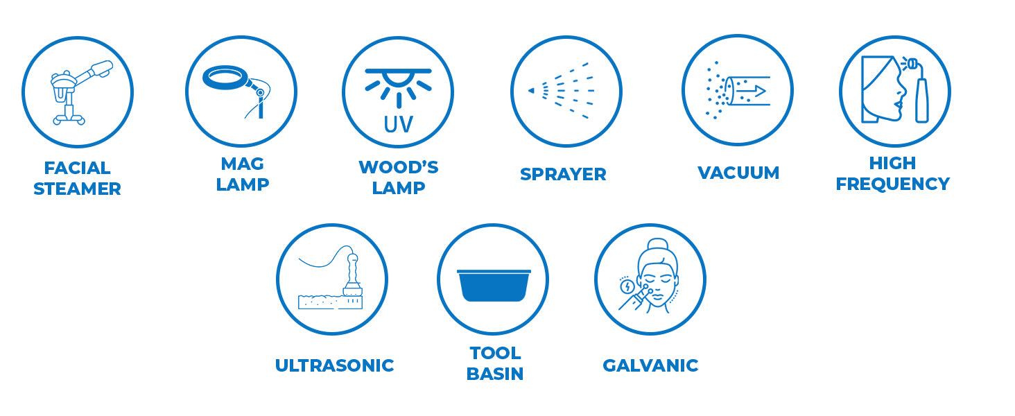 The Pro 12 Function Skin Care System offers a comprehensive range of components, carefully selected to deliver exceptional facial treatments at a highly competitive price point. With a focus on professional-grade results, this system ensures that clients will be delighted with the outcome, ensuring repeat visits. Below, you will find a detailed list of the components and their respective functions.