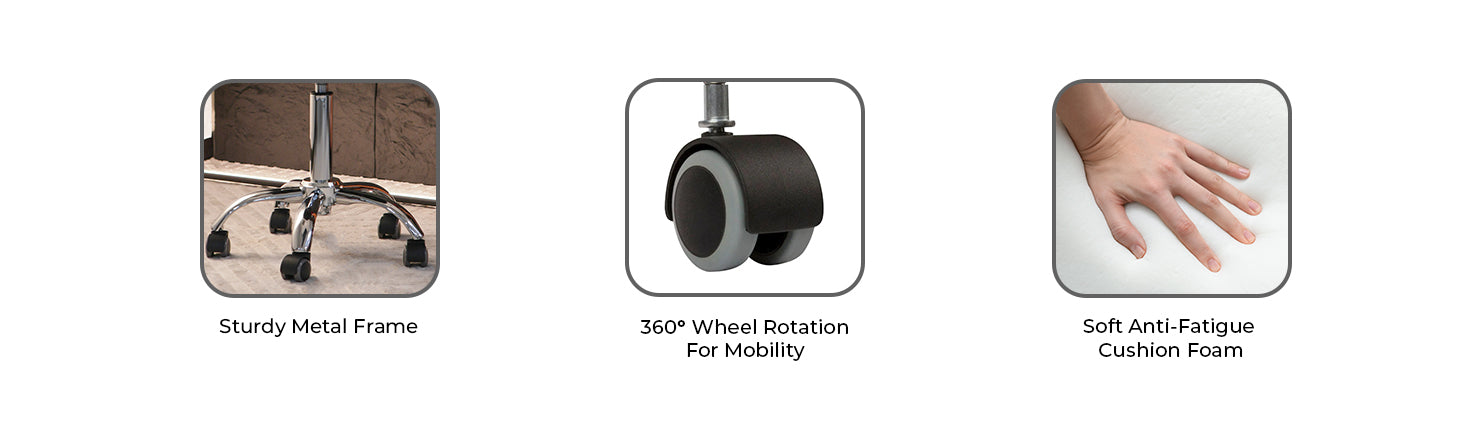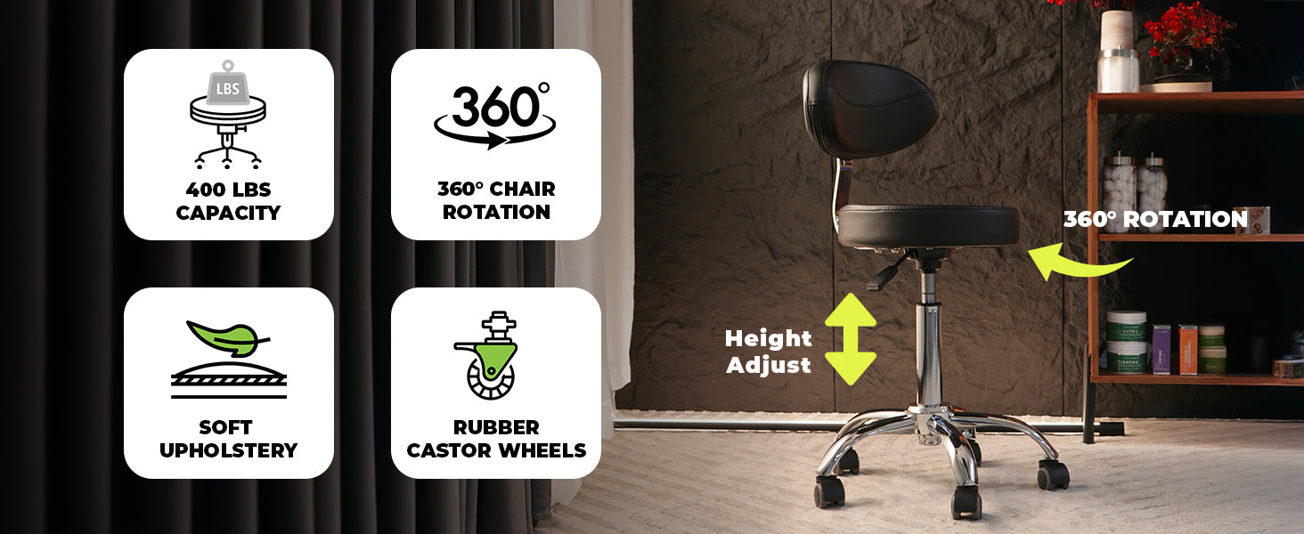The Pro Beauty Stool Esthetician Chair is a sleek and practical seating solution designed for professional salon and spa environments. With a durable hydraulic base and smooth-rolling casters, it allows for effortless height adjustment (from 20.5″ to 26.5″) and easy mobility, supporting up to 400 lb despite its lightweight 20 lb frame. The compact 21.5″ diameter base ensures stability, while the cushioned seat (13.5″ wide) and modest backrest (15″ × 7″) provide ergonomic support for extended use. Available in classic black or clean white and backed by a 1‑year warranty, this chair balances comfort, functionality, and style in one professional package.