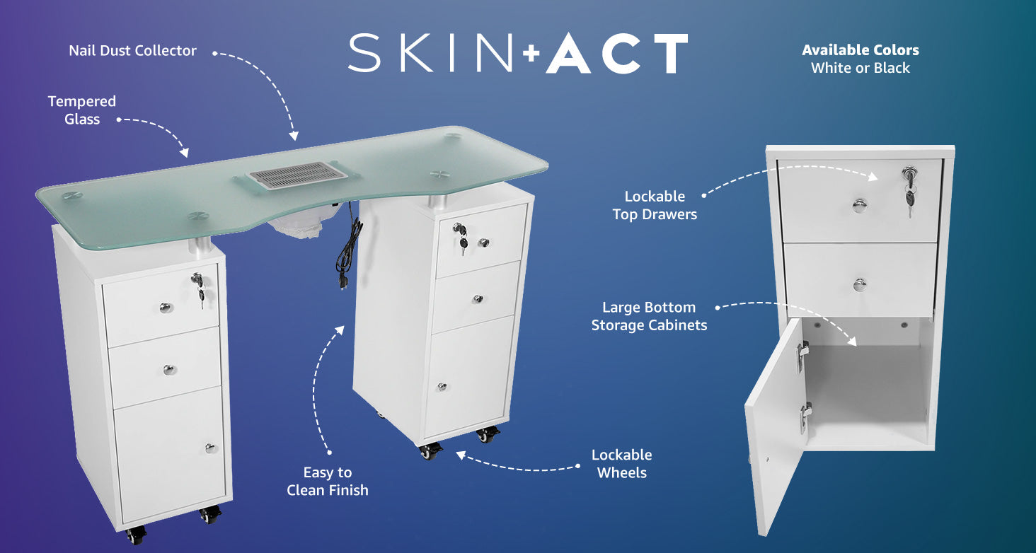 The Pro Manicure Table is a sleek, modern workstation designed for professional salon use, combining style with practical functionality. It features a durable tempered glass top elevated above a spacious cabinet, which includes dual top lockable drawers and additional storage compartments for organizing tools and supplies. A built-in ventilation system with a fan and dust-collection bag helps maintain a clean work area. With a wide knee well and comfortable working height, it ensures ease of use for both clients and technicians. Its streamlined design complements a variety of salon interiors.