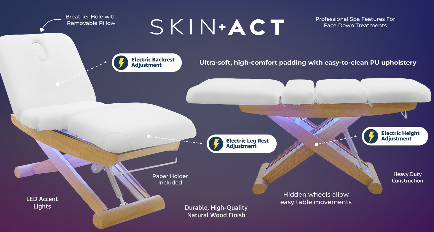 The SkinAct Sage Electric Spa Treatment Table is a premium, multi-functional bed designed for facials, massages, and a wide range of spa treatments. Its smooth electric lift system operates quietly through three motors that independently adjust the height, backrest, and leg section for perfect positioning during face-up or face-down services. The four-section top includes a face hole for prone treatments, and the remote control allows effortless adjustments without disturbing the client. Upholstered in high-quality, easy-to-clean PU leather with plush cushioning, the Sage table combines modern performance with a warm spa aesthetic featuring a wood-style base and hidden mobility wheels.