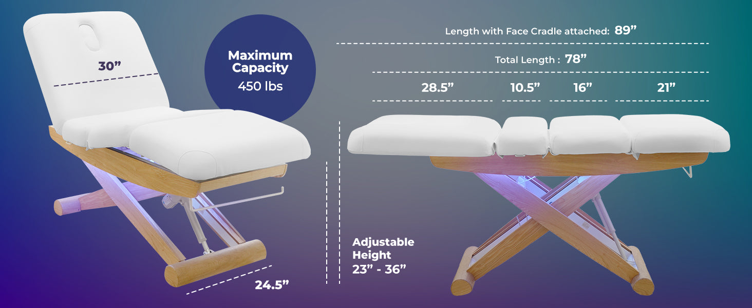 With a working height range of approximately 23″ to 36.5″, this table provides ergonomic comfort for estheticians and therapists. Its sturdy structure supports up to 450 lbs, making it suitable for all client types. Ideal for both day spas and medispas, the Sage Electric Spa Treatment Table delivers quiet power, versatility, and luxurious comfort—enhancing the overall client experience while elevating the look and efficiency of any treatment room.