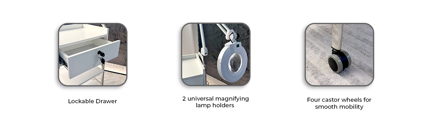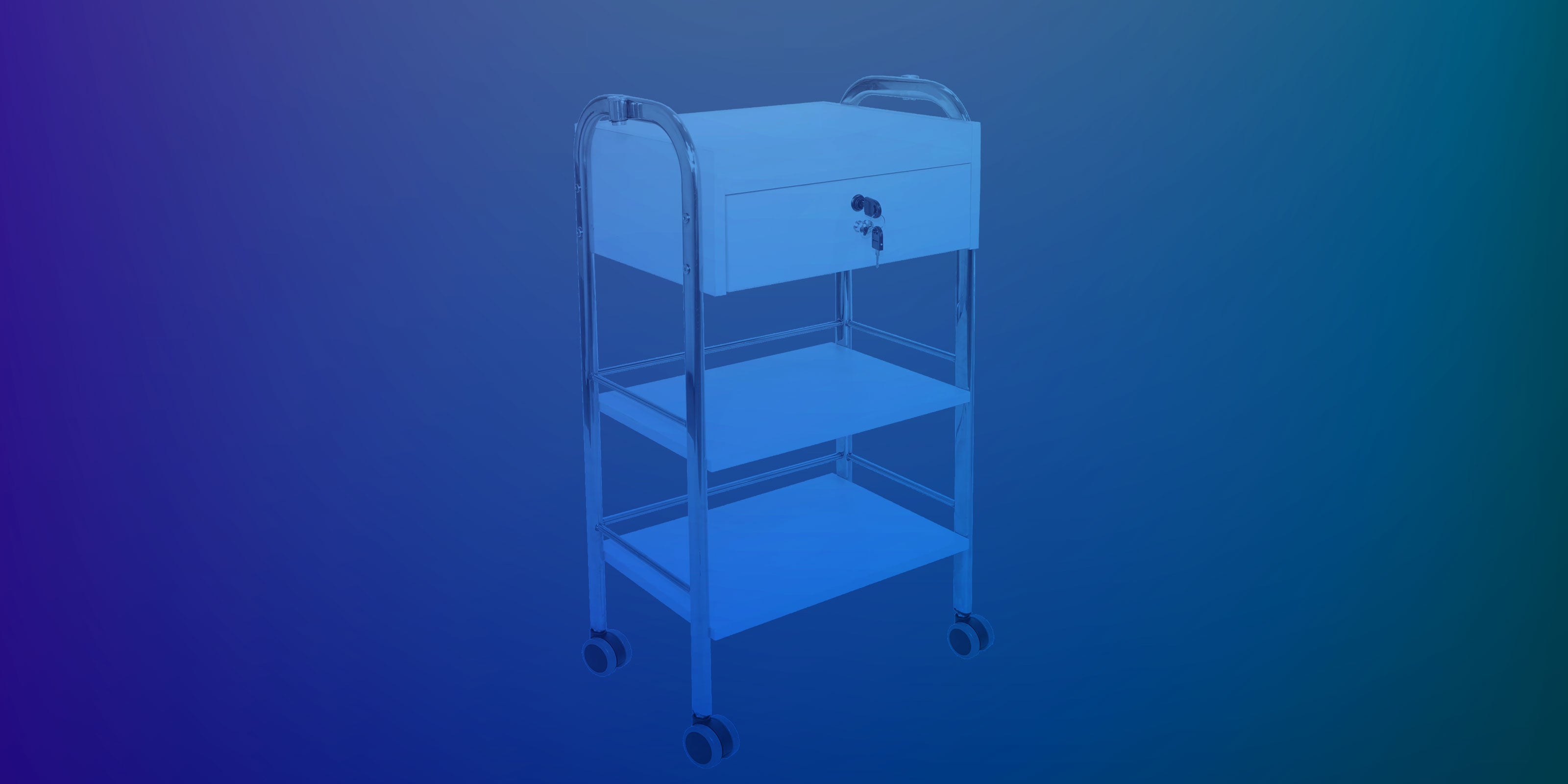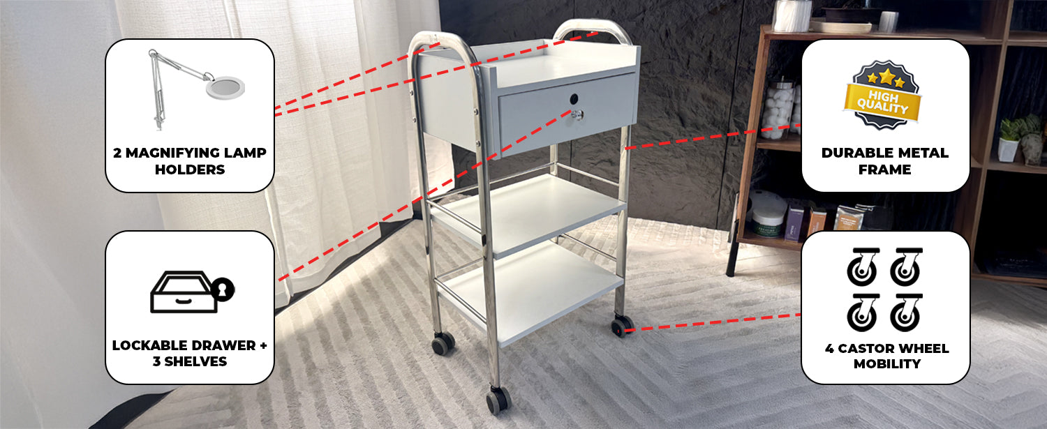 This is a beautiful top-of-the-line salon cart that is sturdily constructed with laminated wood and steel. Attractively designed, it has a drawer, two open storage shelves, and a top work shelf. Of course the four non-stick castors mean that it is a breeze to move around.