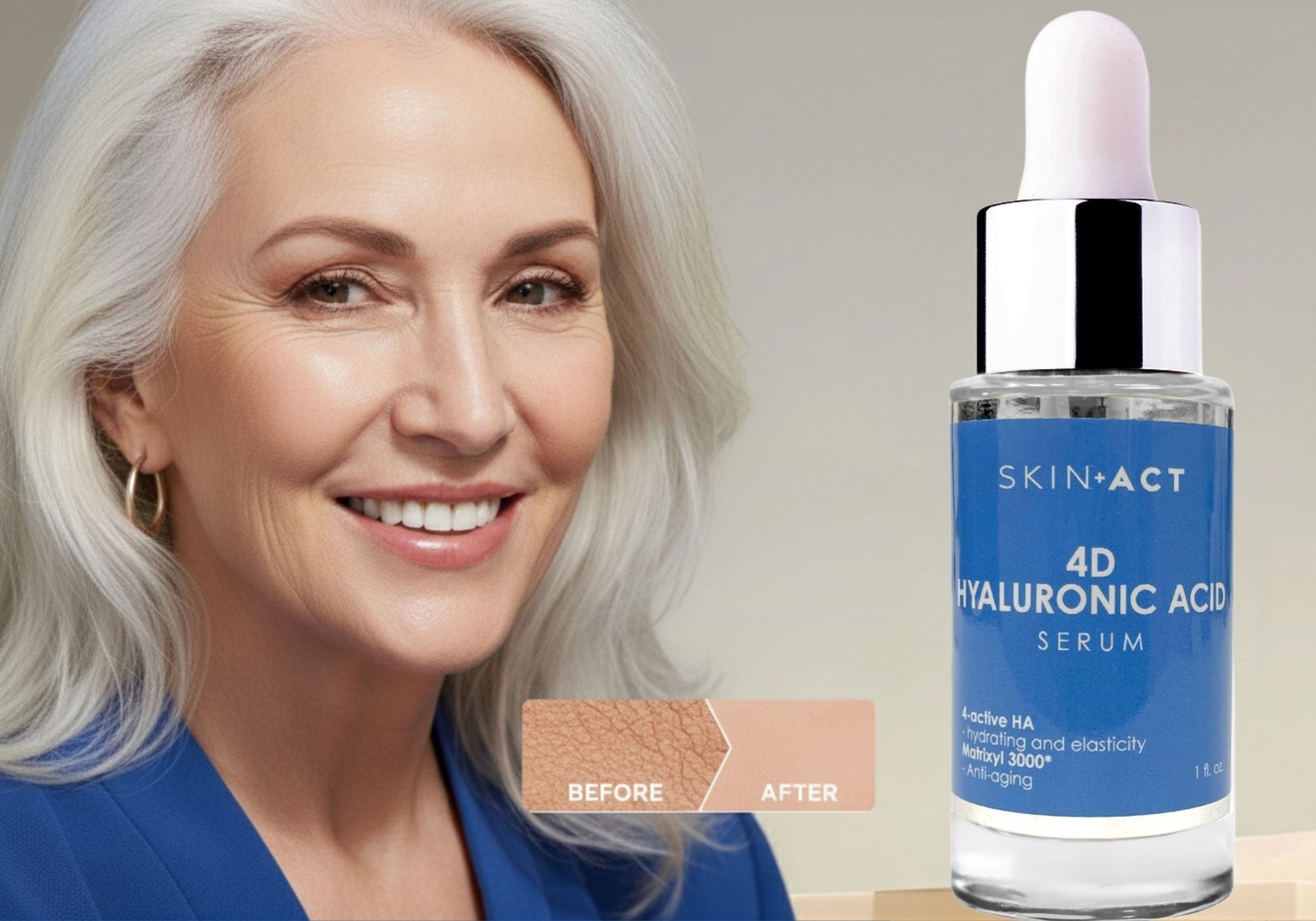 Experience deep hydration and visibly plumper skin with SkinAct’s 4D Hyaluronic Acid Serum.