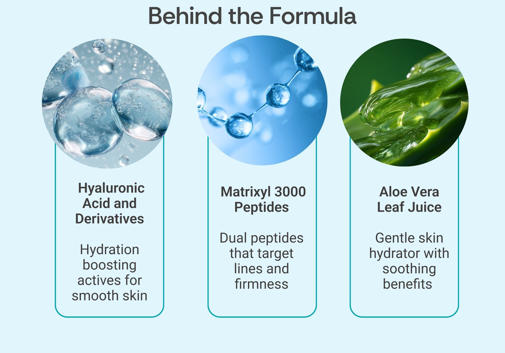 Aloe Barbadensis (Aloe Vera) Leaf Juice, Propanediol, Glycerin, Leuconostoc/Radish Root Ferment Filtrate, Hyaluronic Acid, Sodium Hyaluronate, Sodium Acetylated Hyaluronate , Hydrolyzed Sodium Hyaluronate, Palmitoyl Tripeptide-1, Palmitoyl Tetrapeptide-7, Xanthan Gum, Butylene Glycol, Carbomer, Polysorbate-20