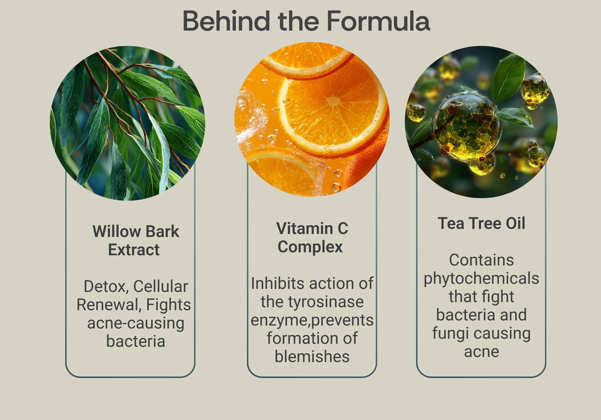 - Willow Bark Extract – A natural source of salicin that gently exfoliates, clears pores, and supports cell turnover
