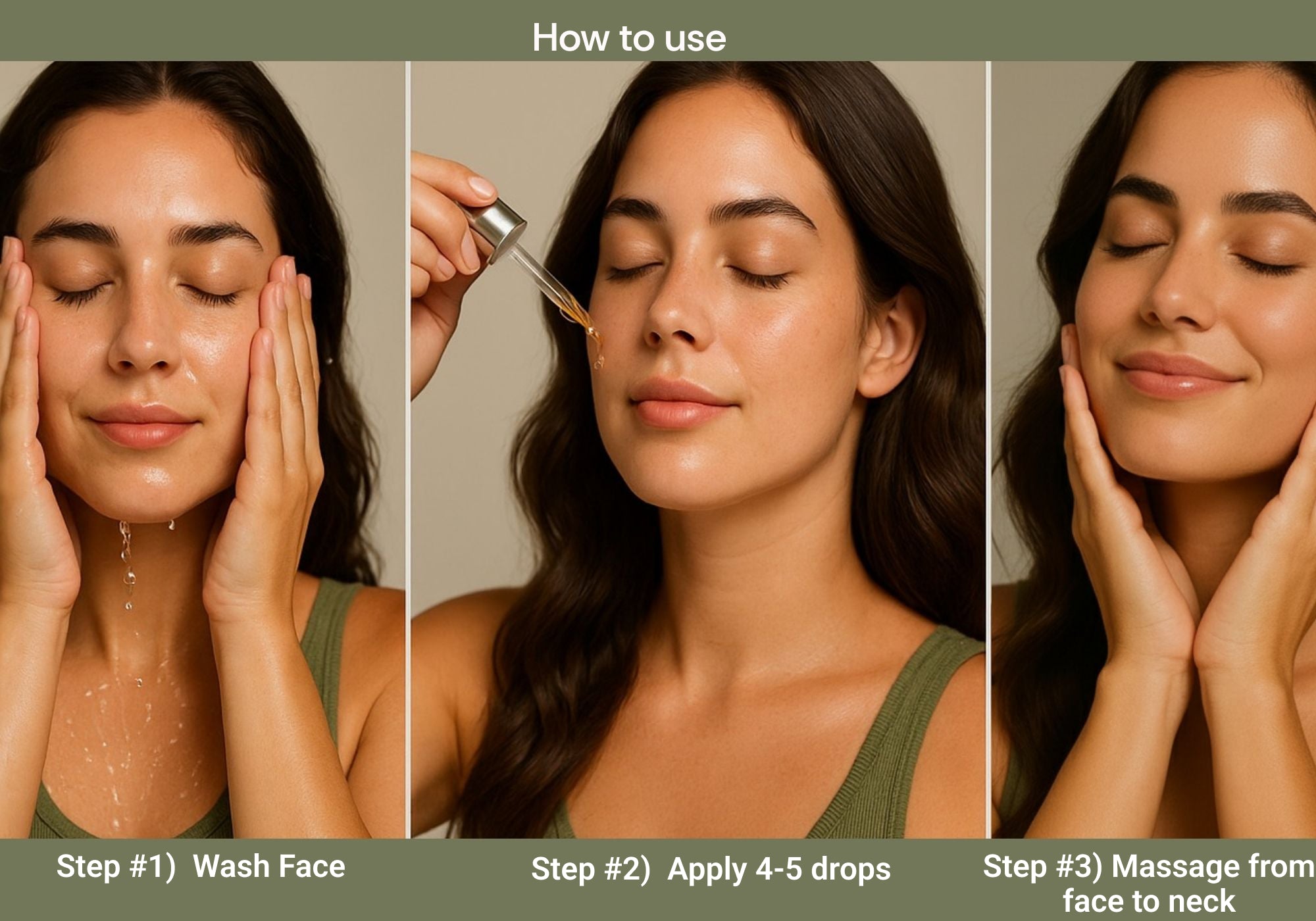 Apply 4-5 drops to the face and neck every morning and evening. Use alone or as a supplement to your moisturizer. Best use after cleansing with moist skin.