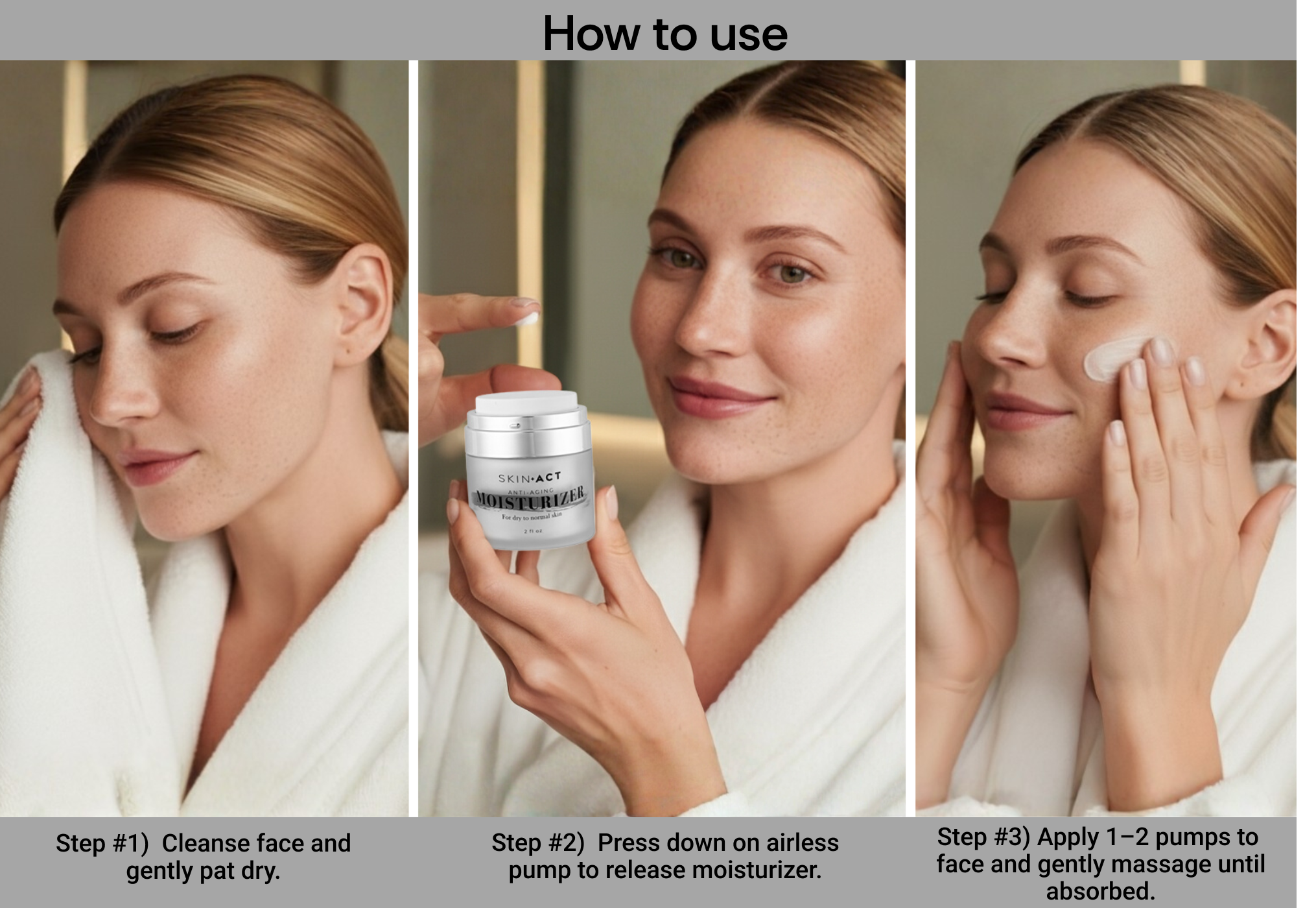 Step 3: Apply evenly to the face using upward, circular motions. Massage until fully absorbed.