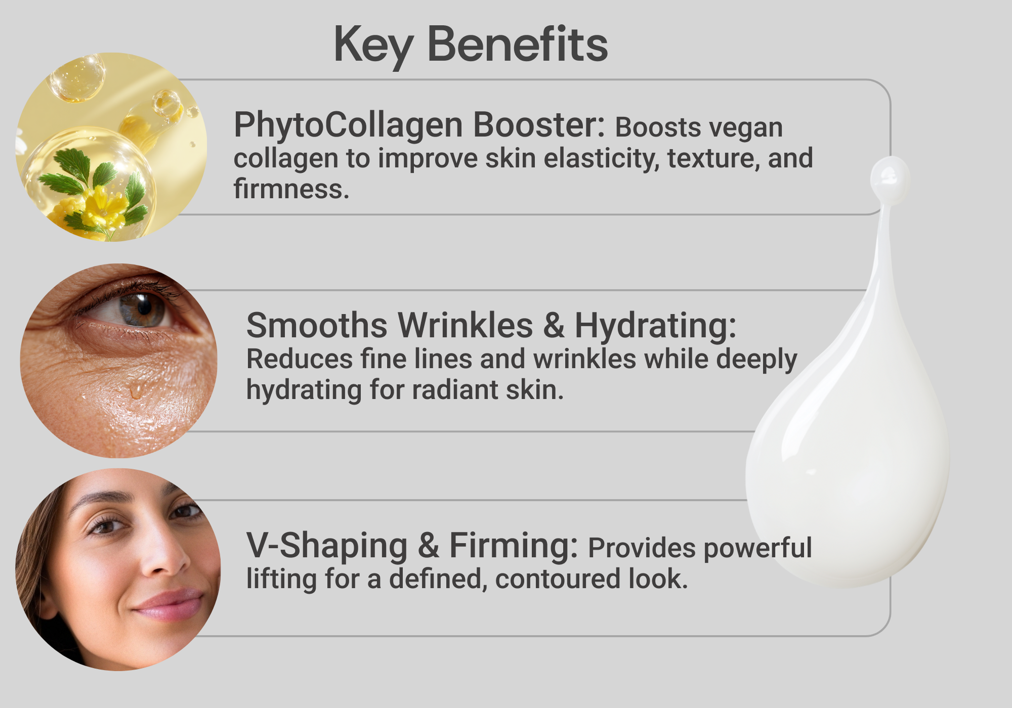 - PhytoCollagen Booster: Promotes high-quality plant-based vegan friendly collagen production, enhancing skin elasticity and firmness.