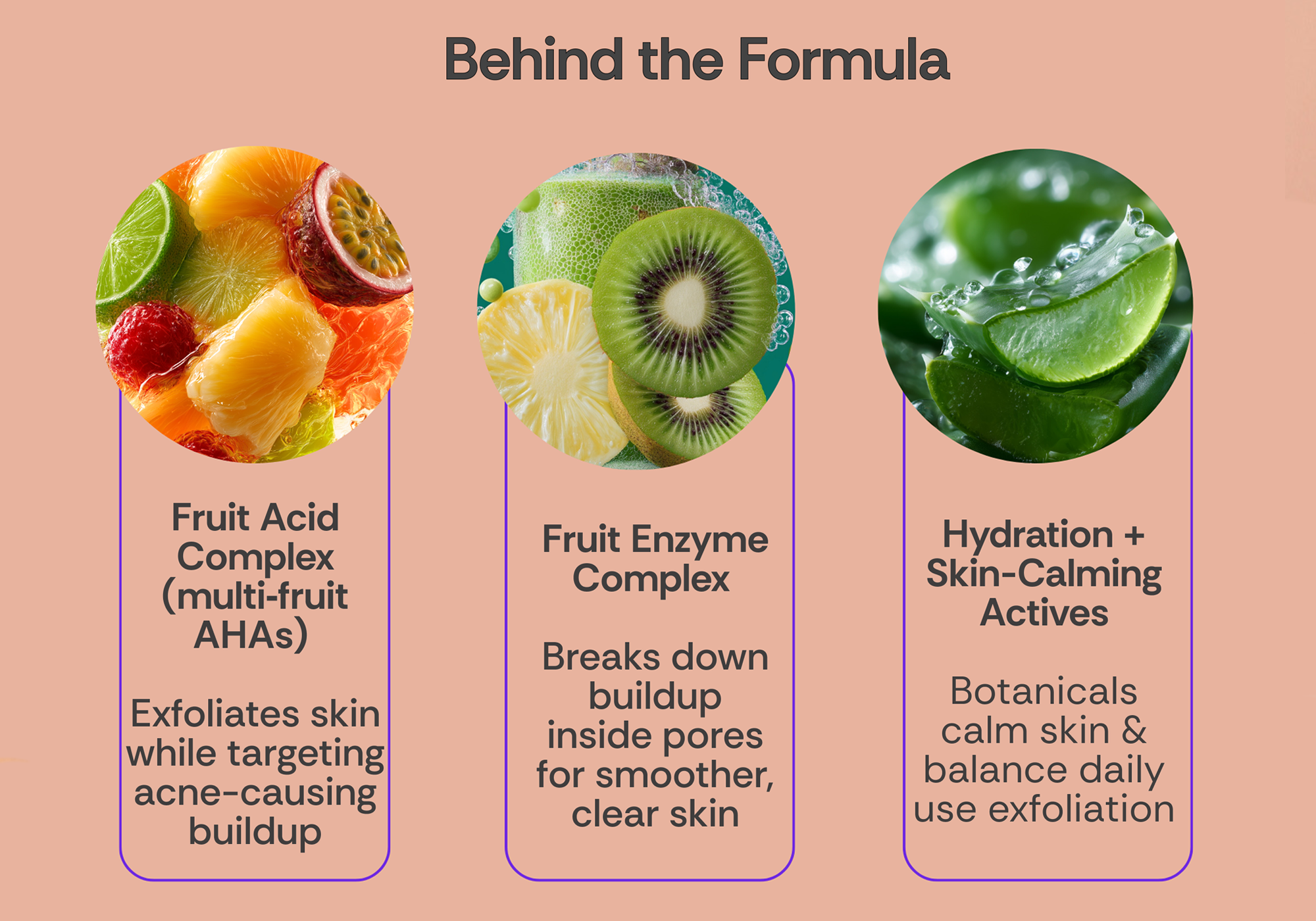 This potent blend of citrus, sugarcane, and sugar maple acids gently exfoliates dull, rough skin and targets acne-causing buildup. AHAs promote healthy cell turnover and a clearer, brighter complexion — without over-drying. - Fruit Enzyme Complex (Papain + Bromelain): Powerful enzymes from papaya, pineapple, kiwi, and mangosteen break down oil, dead cells, and debris inside pores. This helps refine skin texture and reduce congestion while boosting skin clarity.