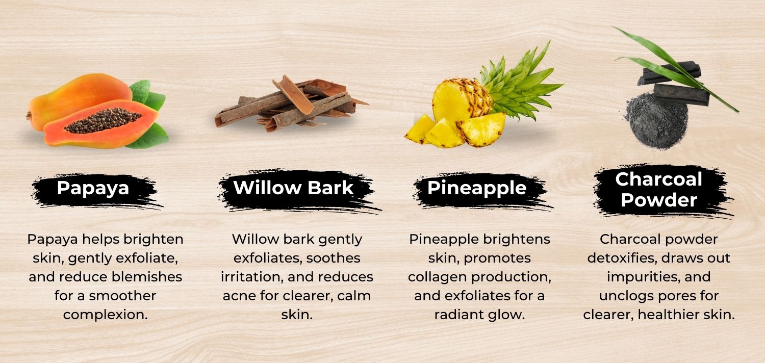 Dextrose, Kaolin, Sodium Alginate, Calcium Sulfate, Sodium Pyrophosphate , Charcoal Powder, Salix Nigra (Willow) Bark Extract, Willow Bark Extract, Bromelain (Pineapple Fruit Enzyme) , Papain (Papaya Fruit Enzyme), Pumpkin Fruit , Protease, Lipase, Maltodextrin, Tea Tree Oil