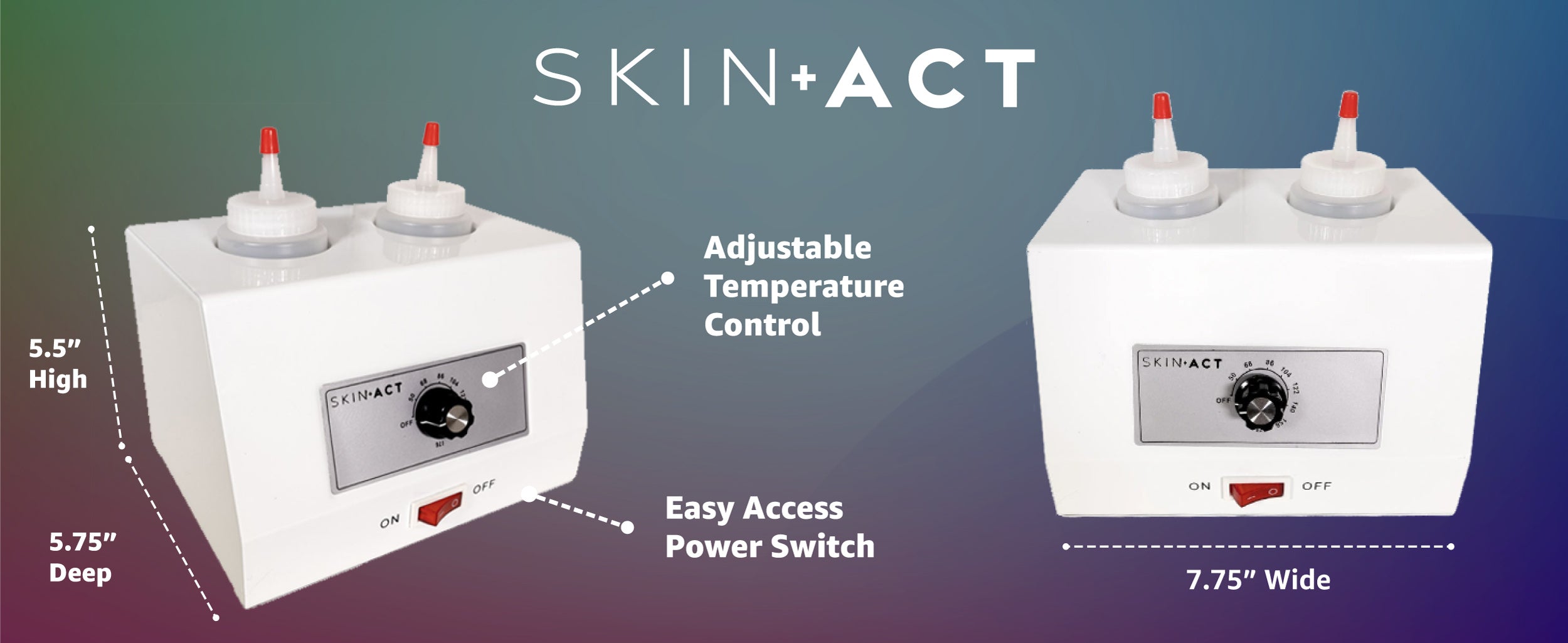 The SkinAct Electric Double Bottle Warmer is a professional-grade solution designed for spas and salons, featuring industrial heating control and a heating coil system. With a power output of 100 Watts and operating at 60Hz, it efficiently warms ultrasound gels, massage oils, and lotions for enhanced client comfort. Its adjustable temperature settings, ranging from 0°C to 85°C (+/- 5°), provide precise control to suit various product types and user preferences. The warmer accommodates 2-inch size bottles on both sides, offering versatility and convenience. Compact and durable, it is an essential addition to any spa or salon, ensuring reliable performance and optimal client satisfaction.