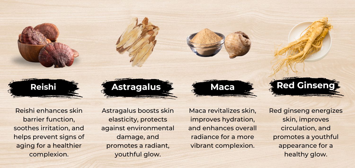 Dextrose, Kaolin, Sodium Alginate, Calcium Sulfate, Sodium Pyrophosphate, Ganoderma Lucidum (Reishi) Mushroom, Hericiume Rinaceus (Lion’s Mane) Mushroom, Cordyceps Militaris Mushroom, Emblica Officinalis (Amla) Fruit, Withania Somnifera (Ashwaganda) Root, Astragalus Membranaceus (Astragalus) Root, Lycium, Barbarum (Goji) Fruit, Lepidium Meyenii (Maca) Root, Panax Ginseng (Red Ginseng) Root, Acanthopanax Senticosus (Siberian Ginseng) Root, Rhodiola Rosea Root, Fragrance