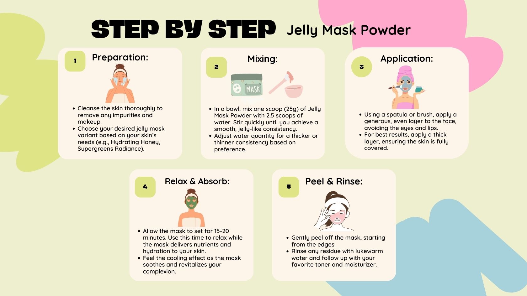 Mix 1 scoop (25g) of powder with 2.5 scoops of water until smooth and pasty (3-5 min). Apply a thick layer to the face, leave on for 15-20 minutes, then peel off. Wipe off any excess with a damp towel.
