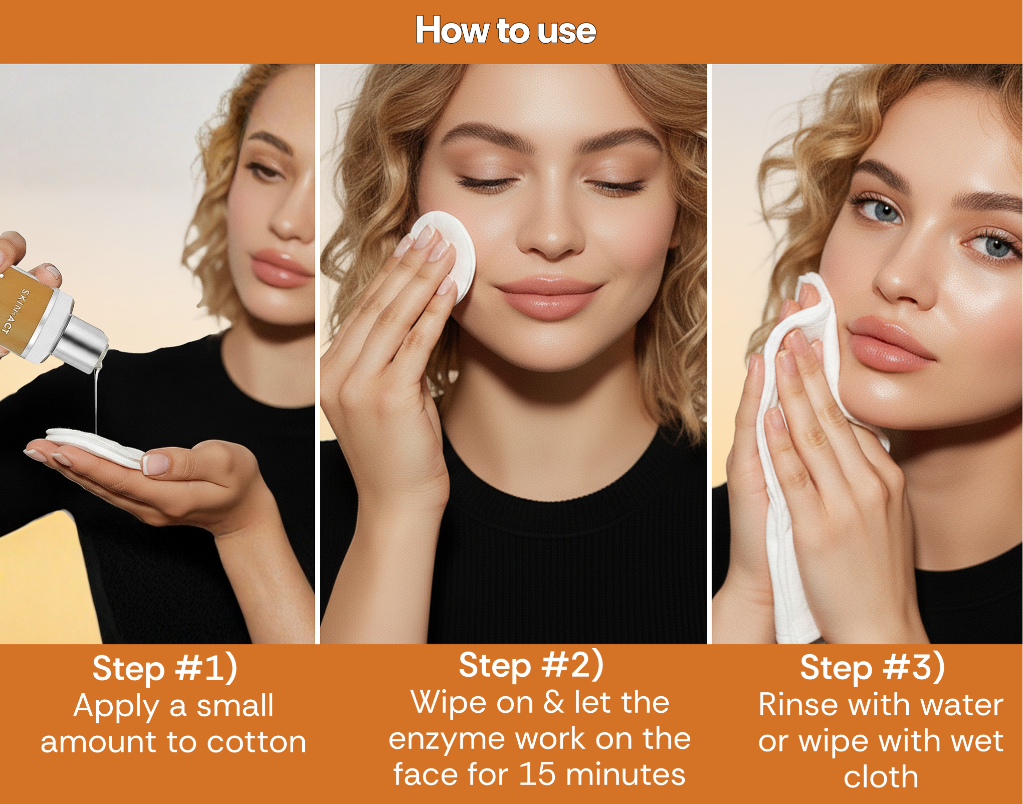 Gently wipe onto clean skin and allow the enzymes to activate for 10–15 minutes. Avoid eye area. - Step 3: Remove