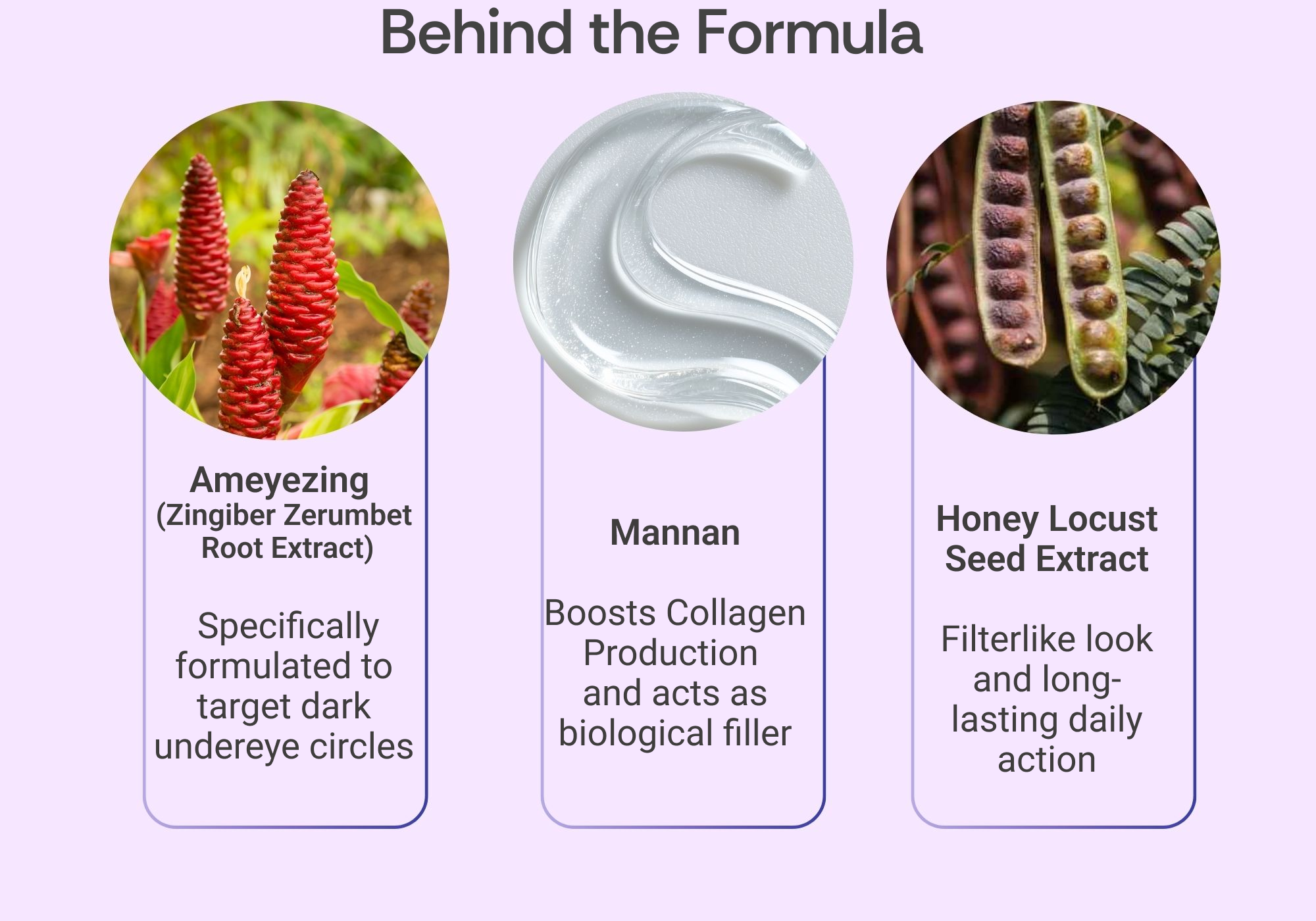 - Ameyezing (Zingiber Zerumbet Root Extract) targets dark under-eye circles and puffiness by improving microcirculation.
