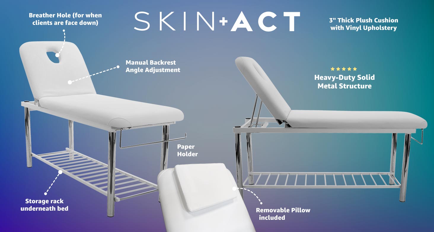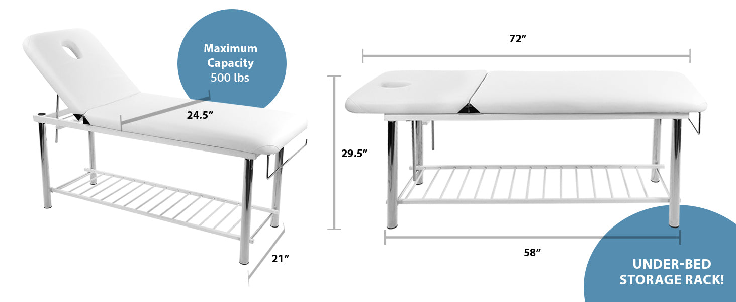 The Solid Massage Table is an ultra-plush table with a metal frame. As a result, it has a tremendous bearing capacity of 600 pounds. The backrest can be raised and lowered effortlessly by hand. There is also a rack on the bottom of the frame for storing towels, tools, and anything else that needs to be kept close at hand.