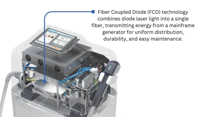Fiber Coupled Diode (FCD) technology delivers precise, uniform energy by transmitting light through a fiber from a mainframe generator. This design ensures superior performance, extended lifespan, and easy maintenance compared to traditional diode lasers.