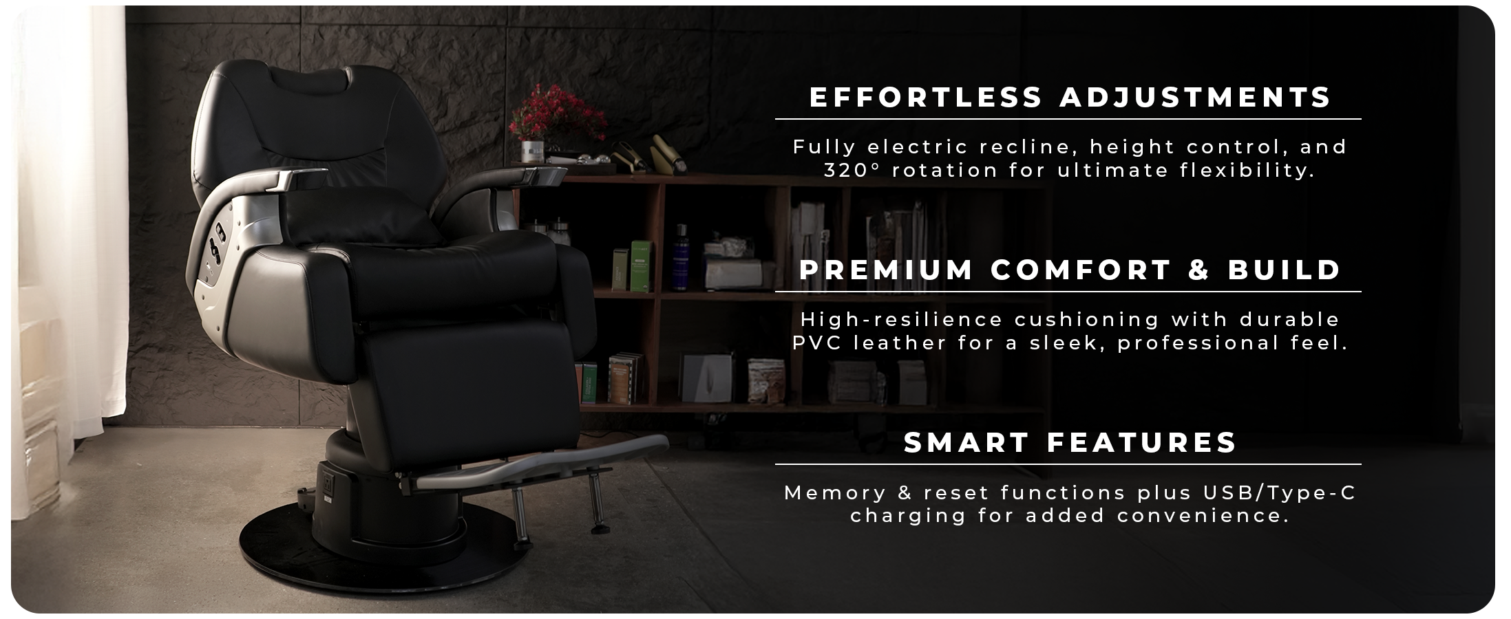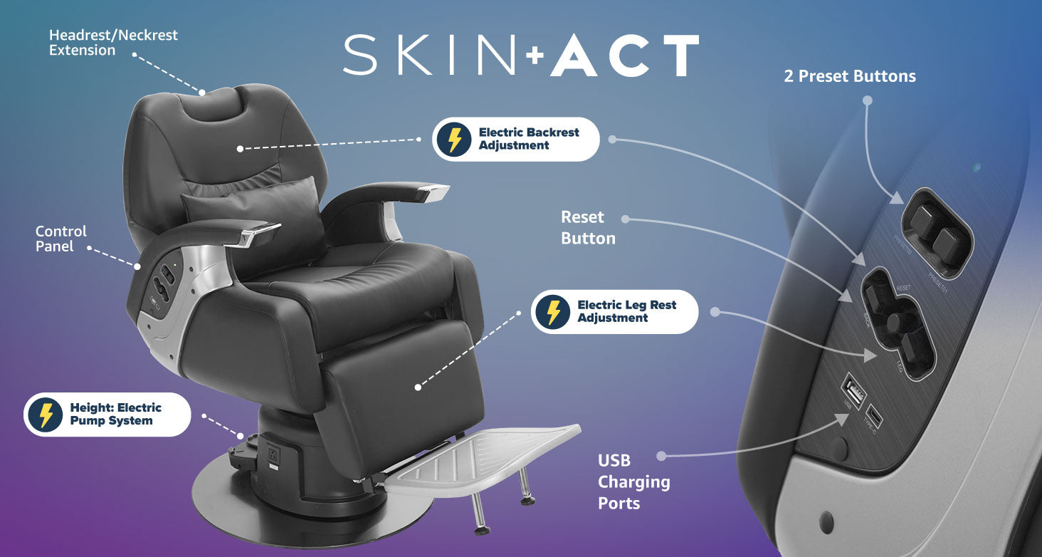 Enhance efficiency with memory and reset functions that allow you to save preferred seating positions and easily return to default with a single touch. The built-in USB and Type-C charging ports keep essential devices powered up, ensuring convenience for both barbers and clients. These advanced features streamline operations and provide a modern touch to the barbershop experience.